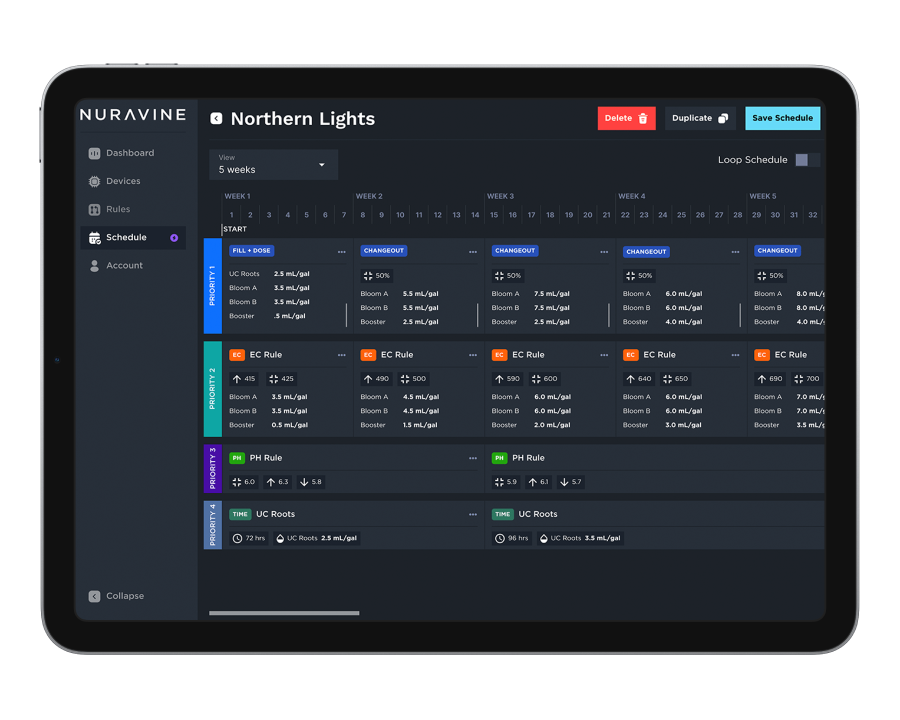 With Aurora, you can choose your own EC and pH management style. Whether you let them drift or stick to precise target values, our system adapts to your preference.